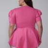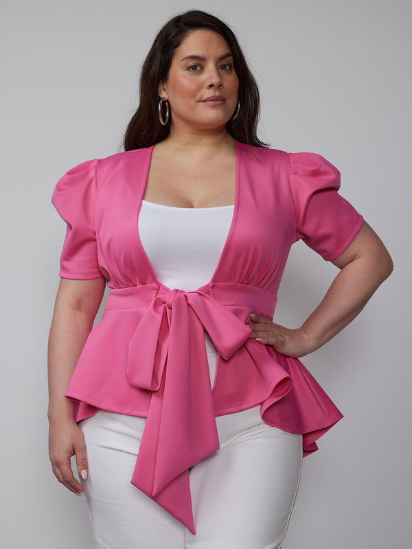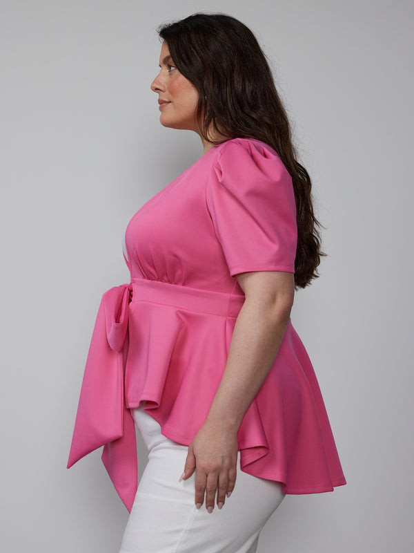 Own the style game this season in this cool plus size top for women! The short puff sleeves and bow tie-up detail at the waist create a stylish silhouette, while the high-low ruffle hem adds a touch of modern flair. Perfect for effortlessly achieving a fashionable and on-trend look.
