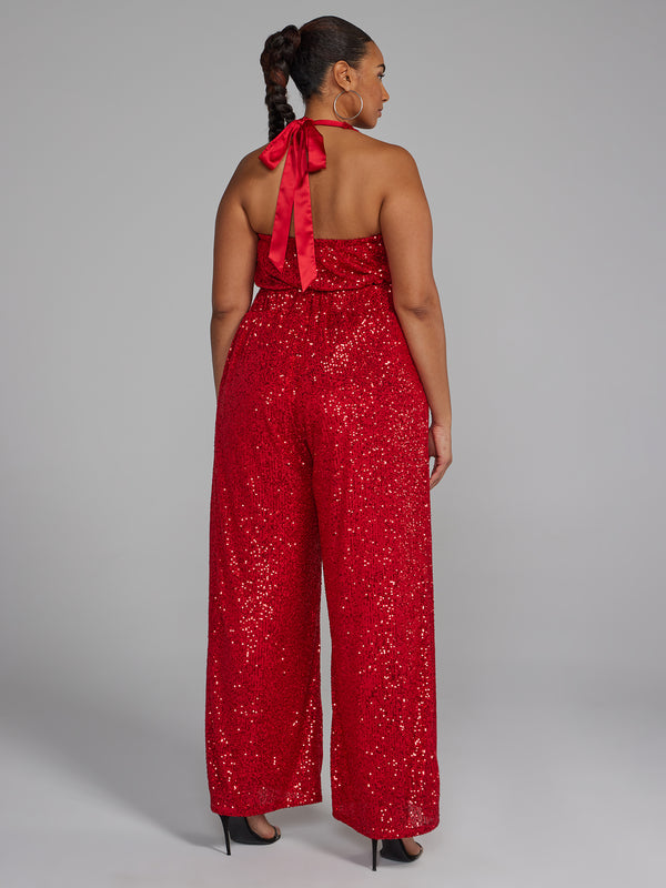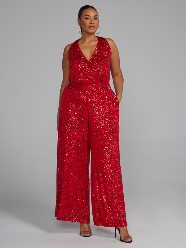Shine bright in the Plus V-Neck Sequin Jumpsuit, a striking piece perfect for any glamorous occasion. Featuring a flattering deep V-neckline and dazzling all-over sequins, this jumpsuit exudes confidence and elegance. The wide-leg silhouette and comfortable fit ensure effortless movement, while the back-tie detail adds a chic touch. Pair it with sleek heels and minimal accessories to let this bold statement piece take center stage. Perfect for parties or red-carpet moments.