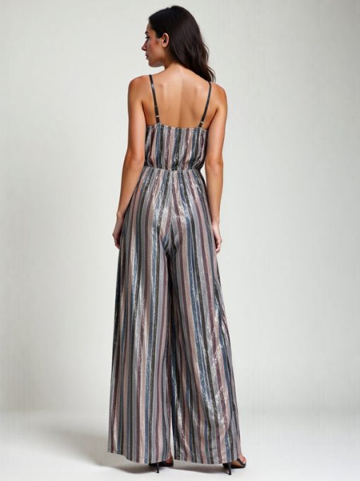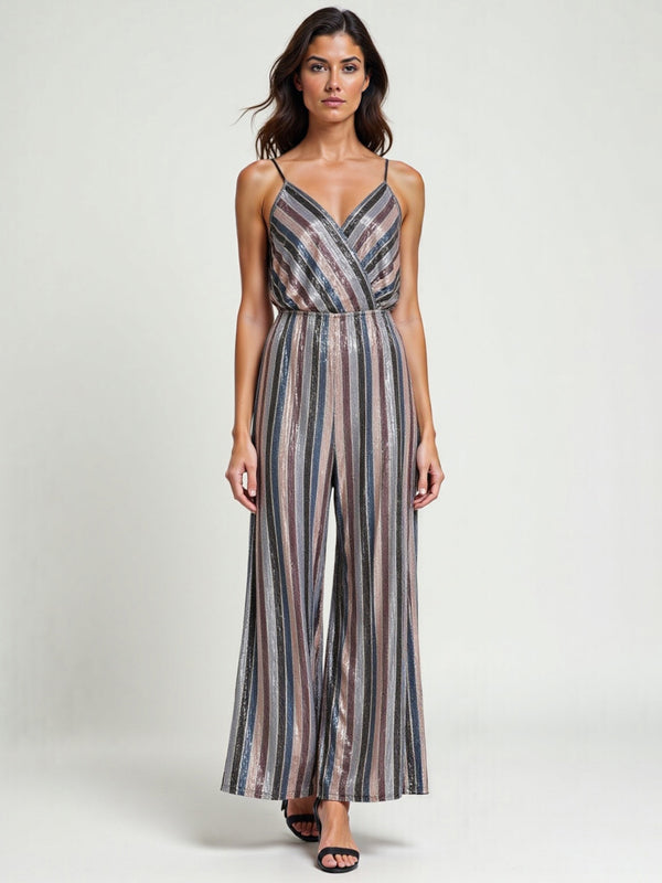 Turn up the glamour with this sleeveless rainbow stripe sequin jumpsuit. Vibrant, bold, and full of personality, this piece is a showstopper for celebrations or nights out. Add neutral heels and simple accessories to let the outfit take center stage.